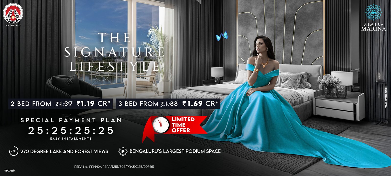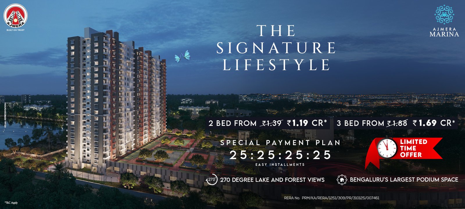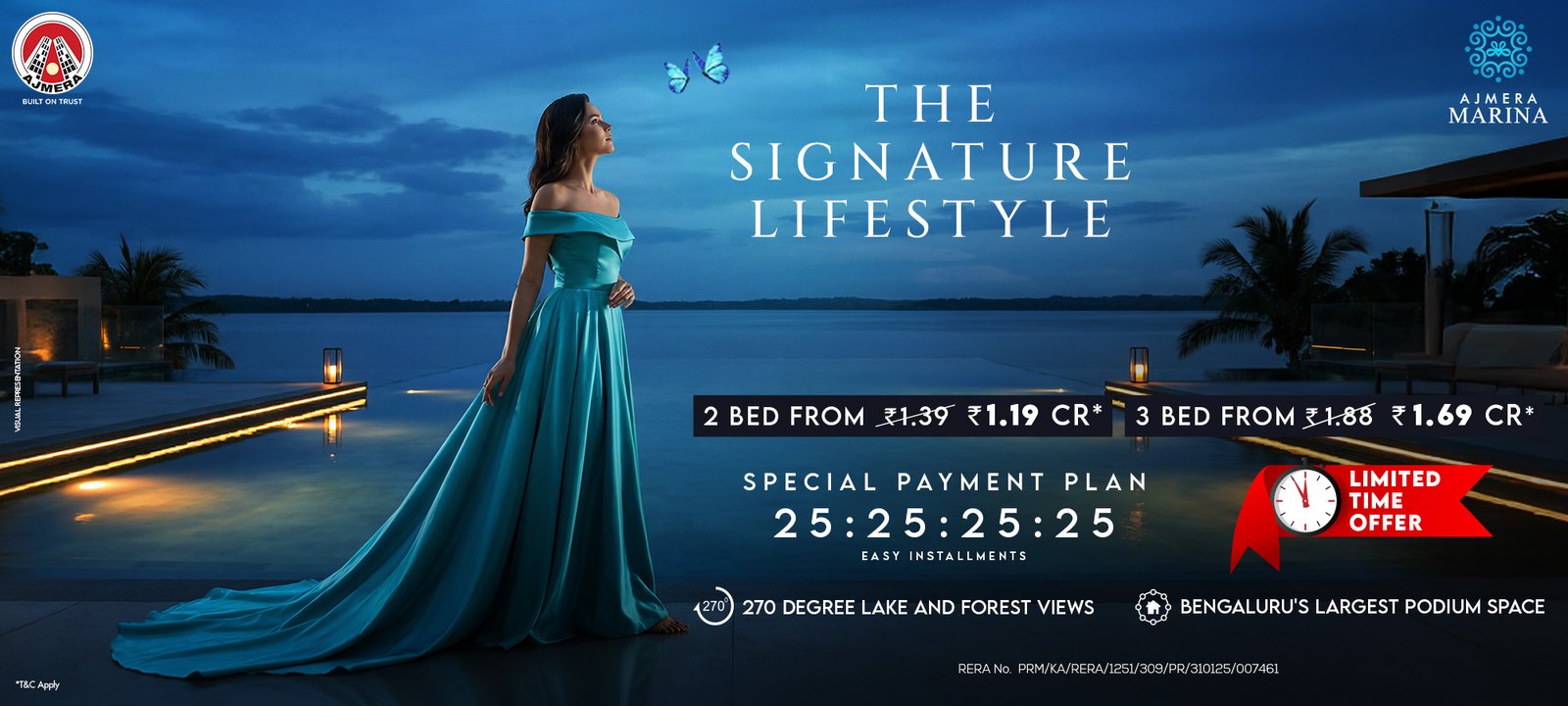 Ajmera Marina Elegance is a premium residential development in Yelahanka, designed to deliver an elevated lifestyle with the perfect balance of luxury, connectivity, and natural surroundings. Wake up to breathtaking 270° lake and forest views, where every home is crafted to offer peace, openness, and a sense of exclusivity rarely found in Bangalore. With Bengaluru’s largest lifestyle podium, residents enjoy a vehicle-free, resort-like environment featuring expansive green spaces, recreation zones, and world-class amenities — all within the community. Adding to its appeal is the flexible 25:25:25:25 payment plan, making luxury living more accessible while ensuring financial convenience for homebuyers. Strategically located in North Bangalore (Yelahanka), the project benefits from rapid infrastructure growth, proximity to the airport, and strong future appreciation potential. Whether you are looking for a dream home or a smart investment, Ajmera Marina Elegance offers:
